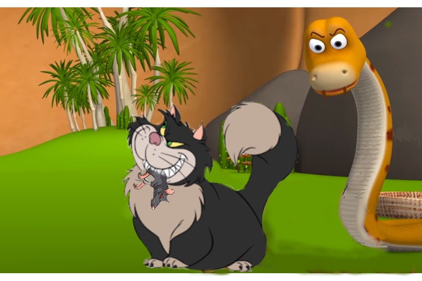 பூனை எலியைப்பிடித்துவரும் என்று பாம்பு காத்திருந்து பசியால் துடித்தது. பூனைமீது அதற்கு கோபமாக வந்தது.