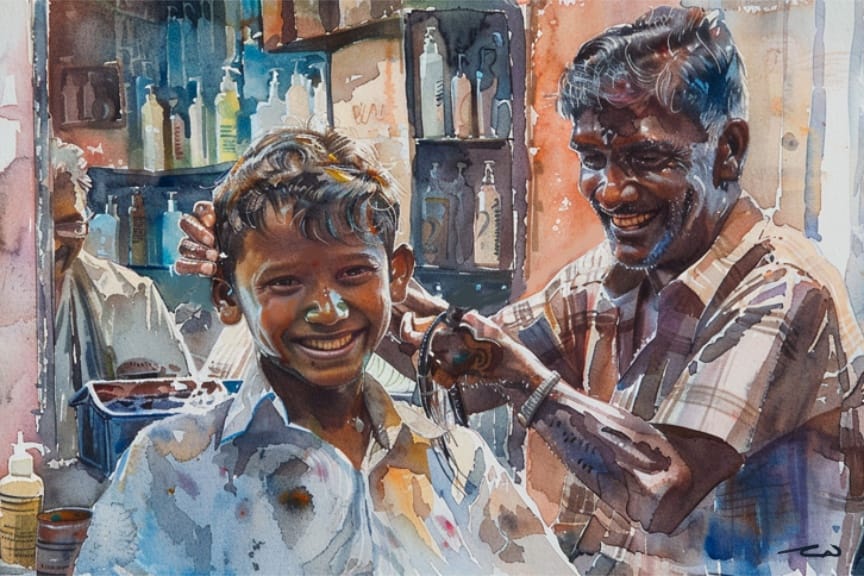 பல காரணங்களால் தள்ளிப் போனதால் ராஜாவுக்கு ஐந்து வயதில்தான் மொட்டைபோட்டு காது குத்தினார்கள். அடுத்த சில மாதங்களில் முடி வளர்ந்திடவே அவனை ஒரு முடி திருத்தகத்தில் உட்கார வைத்து, “தம்பையா, இவனுக்கு நல்லா கரவ்வா வெட்டிவிடு. ராஜா, சட்டைபையில் இருக்கும் காசை கடைக்காரரிடம் கொடுத்திட்டு, எங்கியும் பராக்கு பார்க்காம ரோடு ஓரமாவே நடந்து வீட்டுக்குப் போ” என்று சொல்லிவிட்டு போனார் அவன் அப்பா.