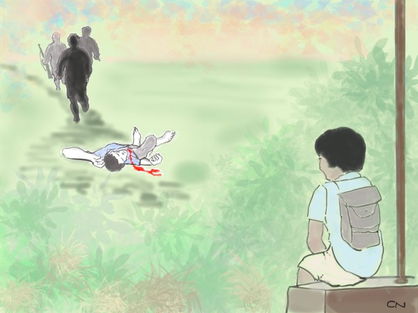 பள்ளியிலிருந்து திரும்பியவன் போல பை மாட்டிய சிறுவன் ஒருவன் வந்தான். கொலைகார்களைத் தெரியும் என்றான். எல்லாரும் காக்கி நிறத்தில் யூனிபாரம் அணிந்திருந்தார்கள் என்றான்.