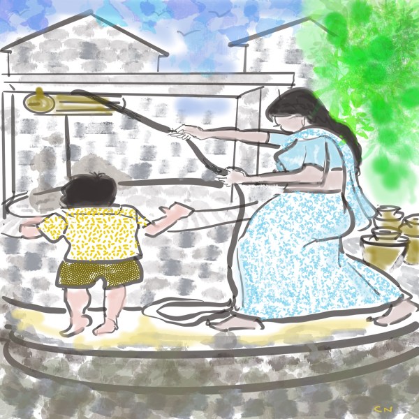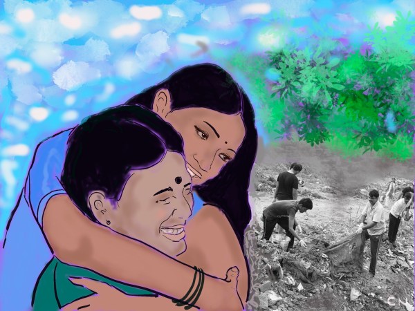 "அந்த நேரத்தில் குப்பை சேகரிப்பவரிடம் குப்பைகளை போட்டுவிட்டு வந்த தம்பி இந்த உரையாடல்களைக் கேட்டு தயங்கியபடி வந்தான்."